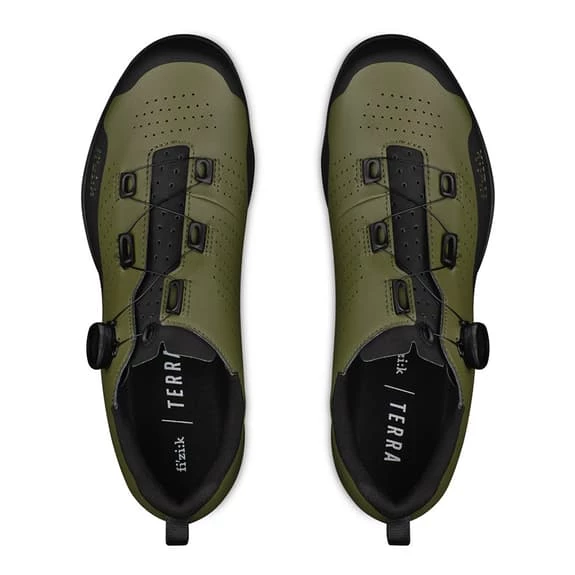 The Fizik Terra Atlas shoes are designed with a generous fit for infinite comfort on a variety of terrain, from gravel trails to MTB trails. Their construction is the result of Fizik’s improvements based on feedback from riders tackling all types of terrain and conditions, from the toughest ultra bikepacking races to local trails. The snug-fitting shell ensures continuous ventilation without sacrificing protection thanks to the TPU toe cap reinforcement. They adjust easily with a convenient BOA closure to fit any situation in seconds. The X5 outsole allows for better grip and more traction while pedaling. The lugs and the rubber coating covering the entire surface, including the midfoot, provide a secure footing when the roughest trails force you off the bike. Nylon plate hidden inside the sole provides balanced stiffness for pedaling efficiency.