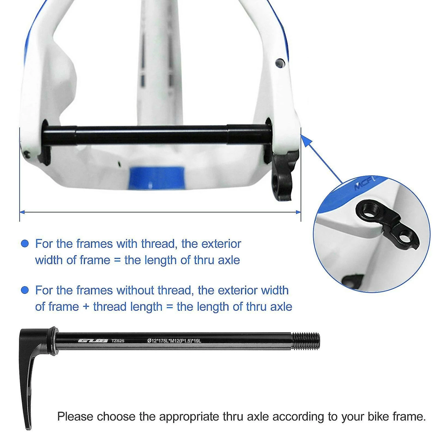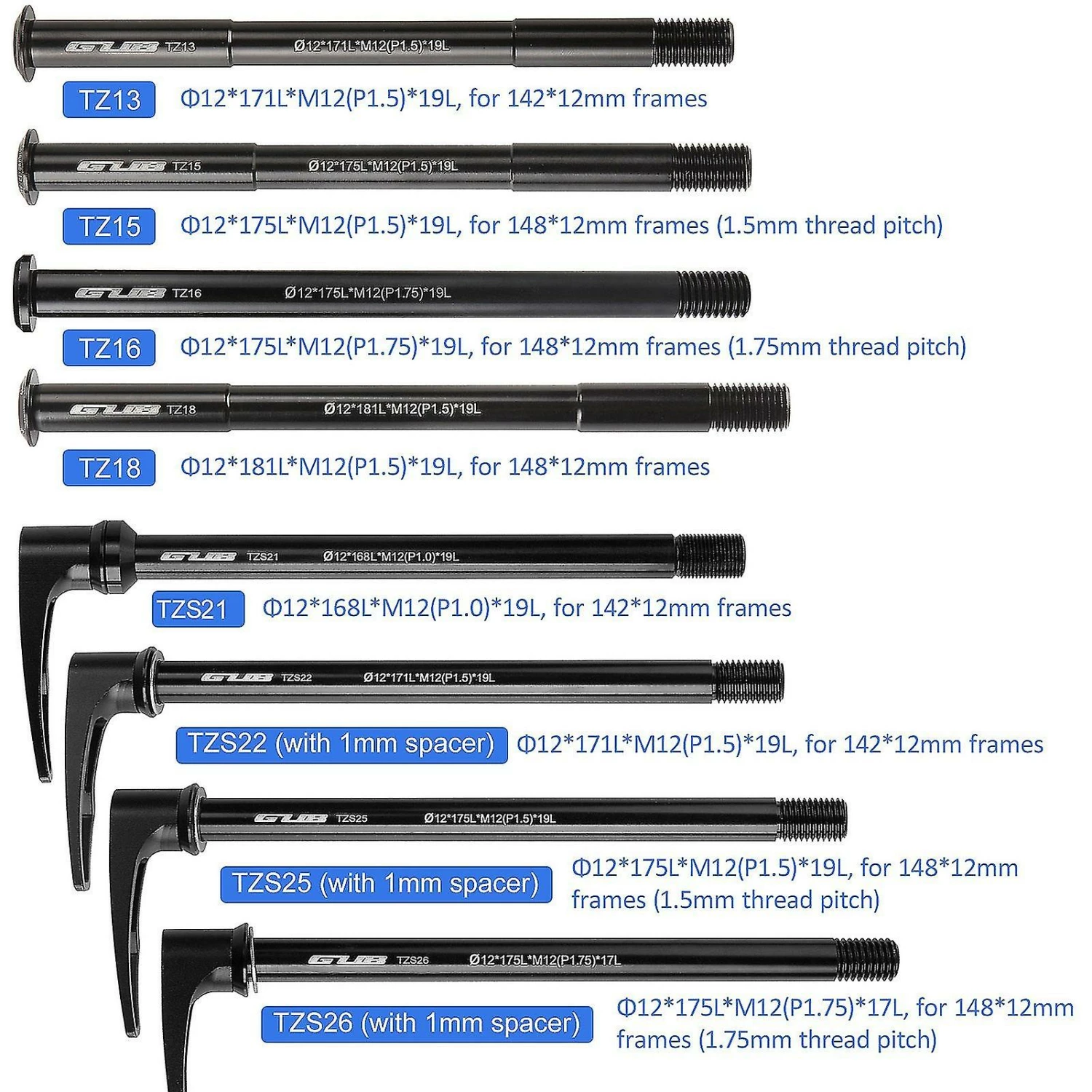 Material: Aluminum alloyModel: TZ13 / TZ15 / TZ16 / TZ18 / TZS21 / TZS22 / TZS25 / TZS26 (optional)TZ13: 12*171L*M12(P1.5)*19L, compatible with 142*12mm framesTZ15: 12*175L*M12(P1.5)*19L, compatible with 148*12mm frames (1.5mm thread pitch)TZ16: 12*175L*M12(P1.75)*19L, compatible with 148*12mm frames (1.75mm thread pitch)TZ18: 12*181L*M12(P1.5)*19L, compatible with 148*12mm framesTZS21: 12*168L*M12(P1.0)*19L, compatible with 142*12mm framesTZS22 (with 1mm spacer): 12*171L*M12(P1.5)*19L, compatible with 142*12mm framesTZS25 (with 1mm spacer): 12*175L*M12(P1.5)*19L, compatible with 148*12mm frames (1.5mm thread pitch)TZS26 (with 1mm spacer): 12*175L*M12(P1.75)*17L, compatible with 148*12mm frames (1.75mm thread pitch)