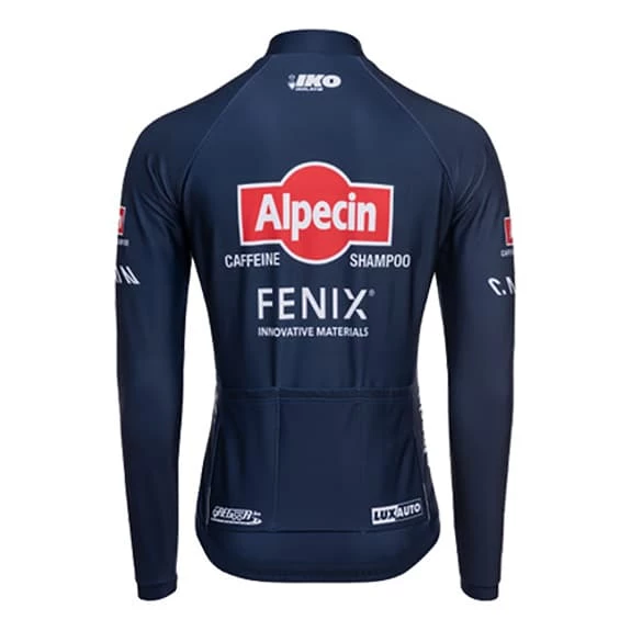 The Alpecin-Fenix Cycling Team long sleeve jersey is a jersey supplied to the Alpecin-Fenix professional continental team from its Elite range. This jersey combines two highly functional materials and is constructed with an aerodynamic design and a skin-tight anatomical cut. They have used a stretch fabric on the front and rear panels to provide breathability, and Stripes material on the shoulders to improve aerodynamic efficiency on the bike.