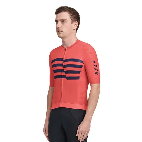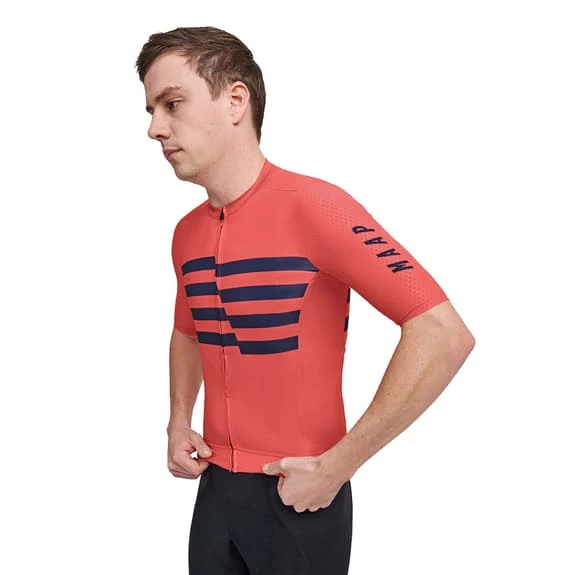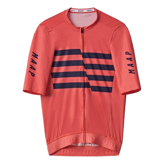 The MAAP Emblem Pro Hex short sleeve jersey is designed to keep the body ventilated on hot days. Combines lightweight, breathable technical fabrics made from recycled yarns with Hex tech fabric on the sleeves, optimized for precise fit and aerodynamics. These fabrics wick moisture and allow for quick drying, with micro-perforated back, side and neck panels for increased airflow on hot days.