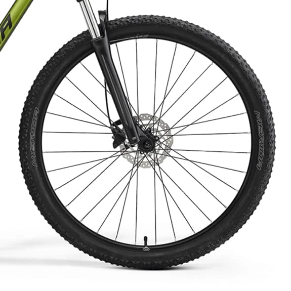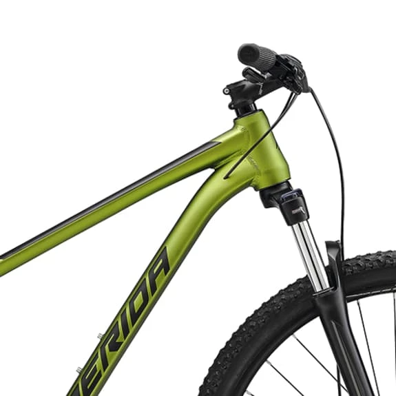 The Merida Big Nine 20 MTB has a more relaxed geometry that is much more comfortable and allows you to ride longer and improve control and stability. If you also want to use it as an everyday bike, you can take advantage of the possibility of mounting mudguards and pannier racks. Tapered steerers have been exclusive to racing bikes until recently. The idea behind this concept is to increase the stiffness of the steering, which is one of the most critical points in the performance of a bike without penalizing the overall weight of the bike. Thanks to the larger diameter of the lower bearing, compared to the upper bearing, the shape of the steering becomes cone-shaped, which considerably increases the stiffness at this point. The Big nine frame makes use of internal cable routing to improve the aesthetics of the bike and reduce maintenance, as the cables are less subject to wear as they are routed inside the frame. The only one they have kept on the outside of the frame has been the rear brake, thinking that doing the maintenance and bleeding of the brake is a more expensive task if the cover goes on the inside.