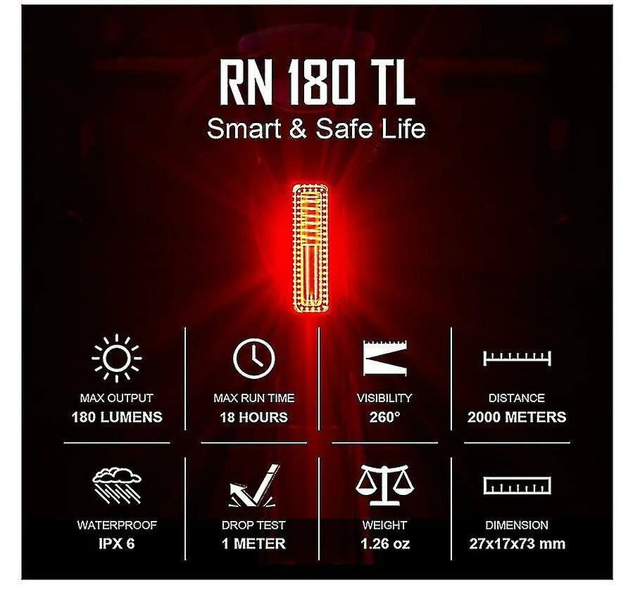 Mssugar Rn 180 Tl Rear Bike Lights 180 Lumens Smart Cycling Tail Lights, Ultra Bright Ipx6 Waterproof Safety Bicycle Taillight 8 Light Modes For Urban Riding