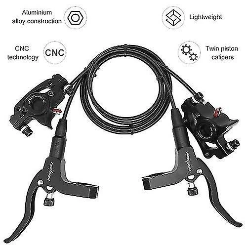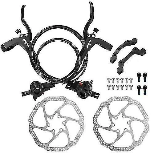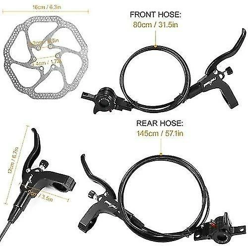 Features: Fit for 22.2mm/0.87in diameter handlebar, suitable for most mountain bike, road bike, fixed gear Bike, MTB etc. Anodized aluminum alloy frame provides strength, ruggedness, and corrosion resistance. Twin piston alloy calipers can make the wheels rest more stable. Ripply surface enlarges the radiating surface and the contact surface. Stainless Steel disc brake rotor, standard 6 bolts pattern, easy to mount on your disc brake ready frame and fork. Suitable for long distance long term use, stable performance. Specifications: Material: Aluminum Alloy. Color: Black. Oil Tube Length: 145 cm / 57.1 in ( rear brake ) ; 80 cm / 31.5 in ( front brake ). Brake Disc Out Diameter: 160 mm / 6.3 in Package Size: 25.3 *20.7 * 7 cm / 10.0 * 8.1 * 2.8 in Unit Disc Weight: 104 g / 3.7 oz Package Weight: 930 g / 32.8 oz Package List: 1 * Pair of Bike Brakes 2 * Disc Brake Rotor 12 * Bolts