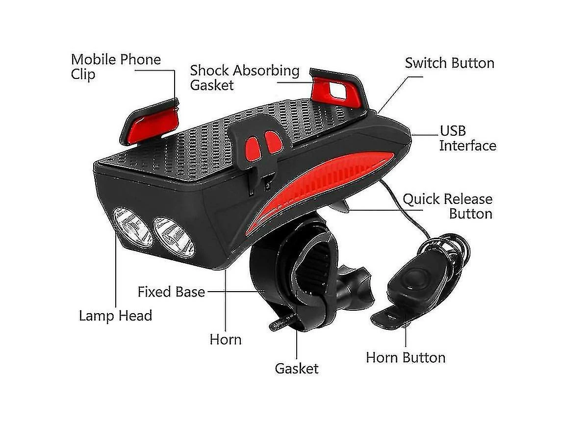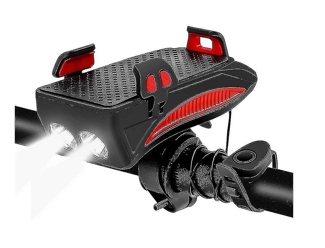 Multifunctional Bike Lights SetThe stand can be multiple used as phone holder, power bank, bike light and bike horn, which is convenient to meet your different need while cycling.Save your money to buy vairous bike equiment.Universal Bicycle HeadlightMade of elastic rubber band, this bike front light can be flexible to fix in the frame of all types of bicycles firmly.The width adjustable bicycle phone holder is also suitable for all smart-phone with size from 4-6.3 inch wide phone, making it a super portable bike front light.USB RechargeableBuilt-in 4000mAh rechargeable lithium battery, this bicycle light will with 8-12 hours running time maximum after 1 hour full charging.USB charging head keep you easy and covenient to charge this light from computers or any device with a USB port.Loud Sounding Bike Horn130 high decibels bell, it will have loud sound to remind passersby in different situations in riding, which will keep you safe during cycling.5 kinds of speaker sound can be switched per your various demand.Wide ApplicationWith waterproof and 3 modes light design, it can be used as emergency flashlight. It is portable for cycling, camping, hiking,or any outdoor activities.