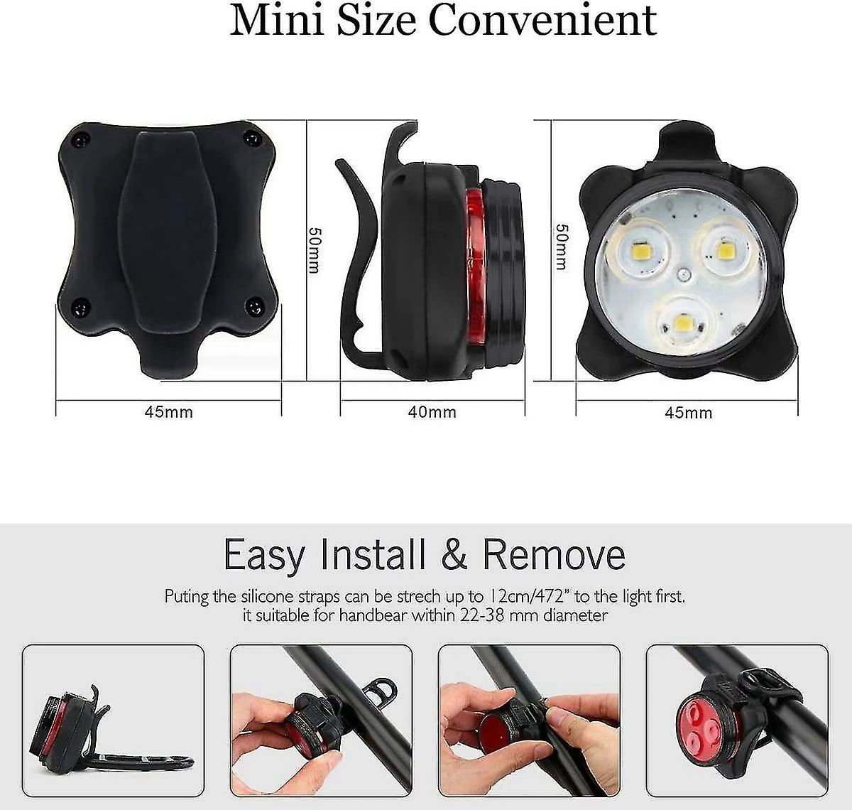 Four light modes: front light supports full brightness, half brightness, fast flashing and slow flashing. Easy to remove and suitable for camping, walking, or outdoor adventure activities. The rear light has a permanent light and flickering mode (4 modes: full brightness, half brightness, fast flashing and slow flashing) to warn the following cars / people.