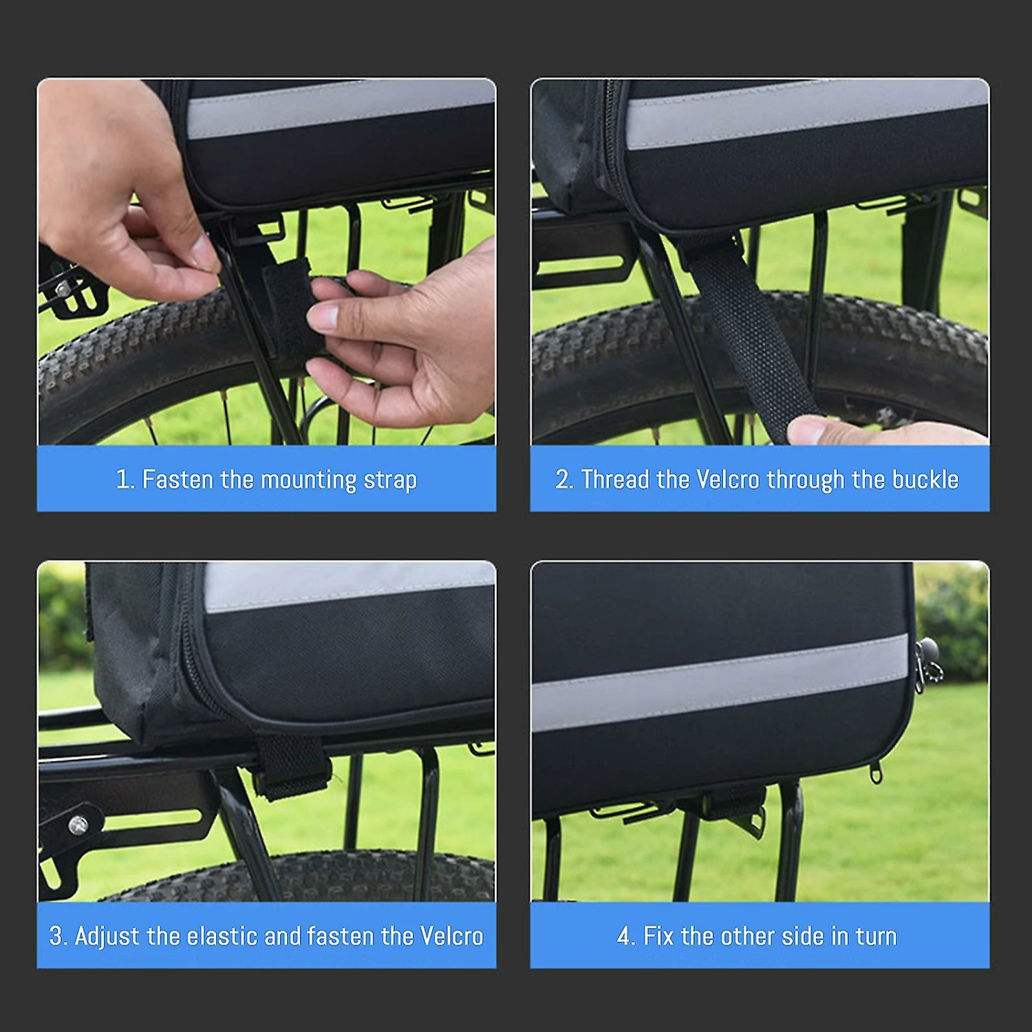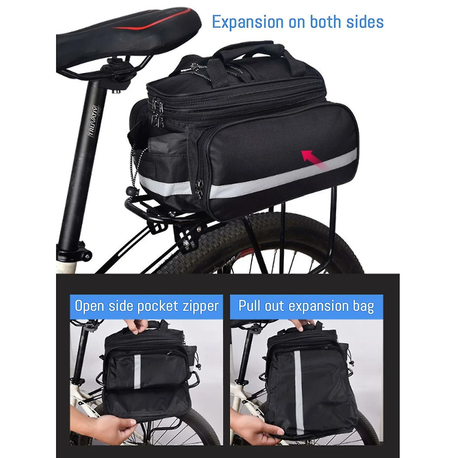 39;t have to worry about getting wet items even in rainy days; Thick, soft pad for things like a era.Large Capacity Design: The main bag of the main body of the pack can store daily necessities, and the thickened body can play a good shockproof effect; and it is equipped with a standard water bottle card slot. Both sides can be expanded, and the height can also be expanded to increase the internal volume.Expandable Design: Our bicycle bag can be expanded and increased in capacity. The normal size is 322618CM; after expansion, the unilateral dimension is approx.32255CM, and the expanded capacity can reach 27L is enough to equip your riding gear.Reflective Warning Effect: There are reflective strips on both sides and back of the bicycle tail bag, which can play a very good warning effect on vehicles and pedestrians in the case of low illumination. Make sure you ride safely at night.Wide Range of Use: Exquisite bicycle backpack, which can be placed on the car, or carried by hand or shoulder; widely used in disc brake mountain bikes, bicycles, and even road touring vehicles; suitable for short and medium-distance travel. Specifications:Material: 600D Oxford ClothColor: Black/Red/BluePackage Weight: approx.690gSize: approx.34x26x18cm/13.38×10.23×7.08in(More Size Details, Please See Photo.) Note:Please allow 1-2cm error due to manual measurement. pls make sure you do not mind before you bid.Due to the difference betn different monitors, the picture may not reflect the actual color of the item. Thank you Package Includes:1Pc x Bike Rear Rack Bag”,