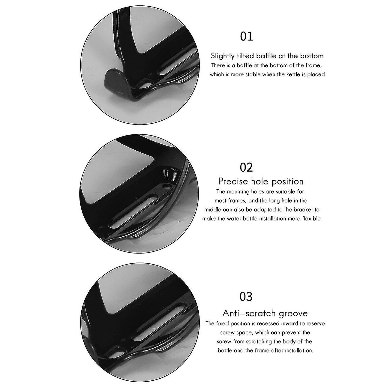 Secure And Sturdy Bottle Retention System – ensures a full bottle stays firmly in place when riding, whether you’re out riding fast on roads or bumpy trails. Fits most standard & over sized bike water bottles, including the following sizes: 20, 21, 25, 24, 25 & 33 oz / ounces (500, 550, 650, 750 & 950 ml sizes). One-piece flexible design, adjustable +/- 0.2 inches / 0.5cm to accommodate slightly smaller or larger sized bike water bottles such as insulated bottles.Superb Durable Quality & Stunning Finish To Match Your Bike – CNC machined aluminium alloy, heated treated compatible with a strong & lightweight design. Powder coated finish and high tumble polished to match your shiny bike paintwork. Extremely easy to wipe off and clean. Lightweight at only 48g/1.69oz.Quick & Easy To Install – Mount on your bike frame in under 60 seconds. Oval mounting holes allow compatible with fine-tuning of position on frame. Important Note: Bike frame requires threaded holes compatible with installation compatible with bottle cage installation. Bottle cage only designed to be mounted on bike frame – seat post tube and/or angled down tube.Colour:blackMaterial:PC plasticSize:152 x 78 x 78mmPackage Contents:2 x Bike Water Bottle Holder (Without screws)Only the above package content, other products are not included.Note: Light shooting and different displays may cause the color of the item in the picture a little different from the real thing. The measurement allowed error is +/- 1-3cm.