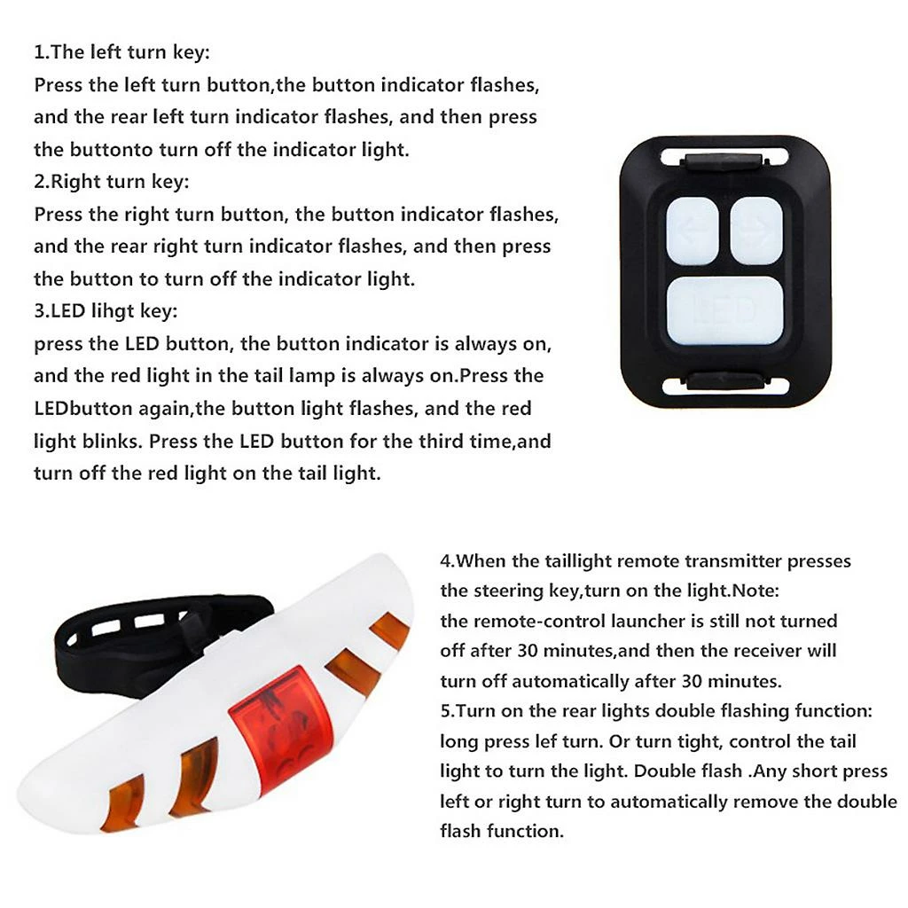 4. The middle button on the remote control can control the red LED warning light of the tail light, and the left and right buttons respectively control the yellow LED direction indicator of the tail light.