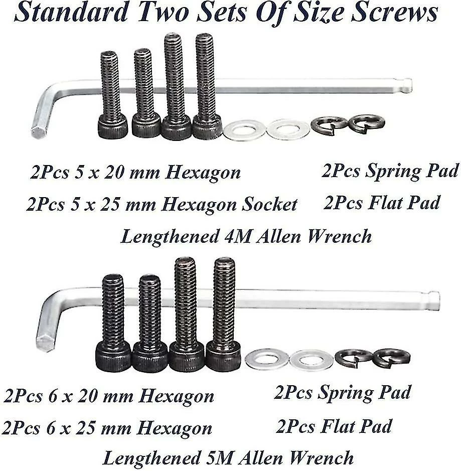 Package Included5*20mm Allen*2, 5*25mm Allen*2, Spring washer*4, Flat washer*4, Lengthened 4mm Allen wrench*1, 6*20mm Allen*2, 6*25mm Allen*2, Lengthened 5mm Allen wrench*1