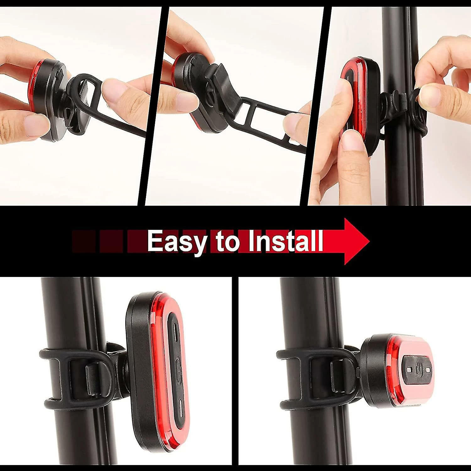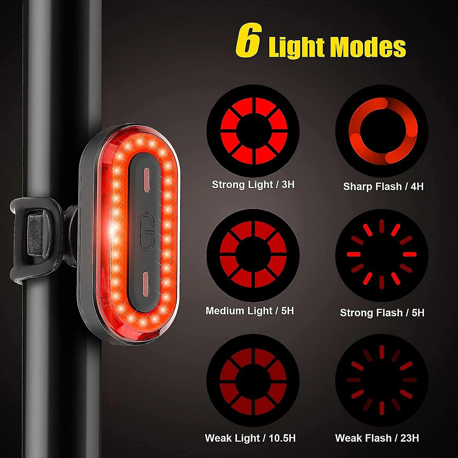 6 Lighting ModesOur rear bike light has six lighting modes (strong light, medium light, low light, weak flash, strong flash, fast flash), the lighting of the bicycle light is bright and not dazzling, different. The modes can be switched freely, suitable for a variety of road conditions.