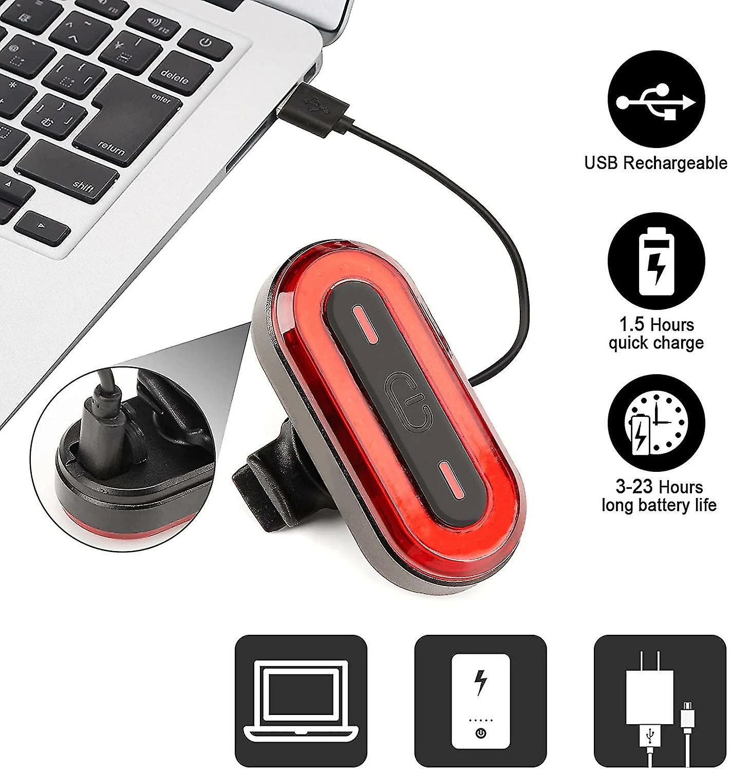 USB Charging and Long-Lasting BatteryThe battery capacity of the bicycle rear light is 400mA, with long life (high light 3h / medium light 5h / low light 10.5h / weak flash 23h / strong flash 5h / fast flash 4h), the bike taillight equipped with USB cable, can be charged with a variety of tools such as chargers, power banks, computers, etc Charging time is only 1.5 hours, convenient and fast.