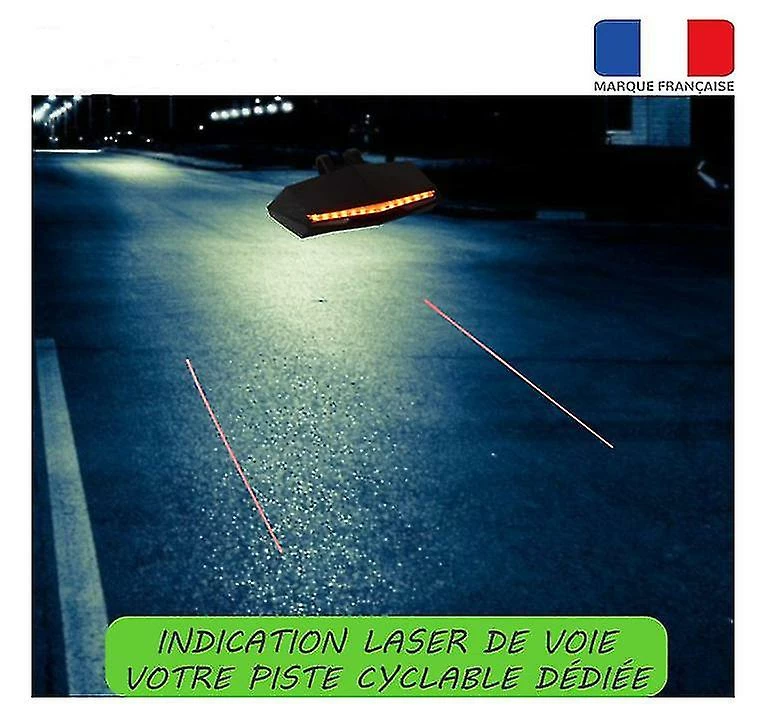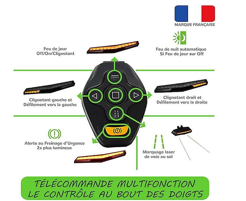 HIGH-BRIGHTNESS LED LIGHTSEquipped with 29 LEDs with a brightness of 85 lumens (compared to 30 lumens on average for most red lights) and 2 lasers that project a powerful beam on the ground virtually marking a bike lane around you, the Bikezen light can be seen as well as any other vehicle such as a car or a motorcycle. Particularly effective when conditions deteriorate such as in the rain, in the mist or even at night.MULTIFUNCTIONAL WIRELESS REMOTE CONTROLVery ergonomic and intuitive with its joystick-shaped buttons, you’ll love it right away. With it, you can activate the red light (fixed, flashing or only lit at night thanks to a light sensor), activate/deactivate the smart turn signals (doubled with a scrolling red light), activate the cycle lane laser beam (steady, flashing or stopped) and finally activate the emergency stop alert which doubles the brightness of the red light.LONG-LASTING RECHARGEABLE BATTERYNo batteries needed