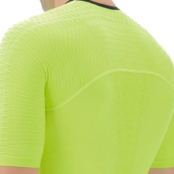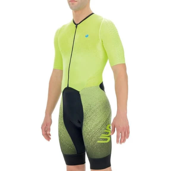 The UYN Biking Ow All-In-One Suit is based on the structure and technologies of the Racefast bib shorts, the best in its collection. Instead of straps, an ultra-lightweight top with a divisible front zip has been integrated. This system allows you to put on the suit quickly and comfortably and use it on any type of rides, instead of wearing the jersey and bib shorts kit. Versatility is also possible thanks to the presence of two back pockets to carry your mobile phone, energy bars and other small items. The shoulder area is made with three-dimensional Haloflex technology with a double function: lower air resistance on the outer surface, and greater ventilation between the skin and the fabric. In the back area, the Coolvent structure absorbs sweat and wicks it to the outside, contributing to the ideal body climate.